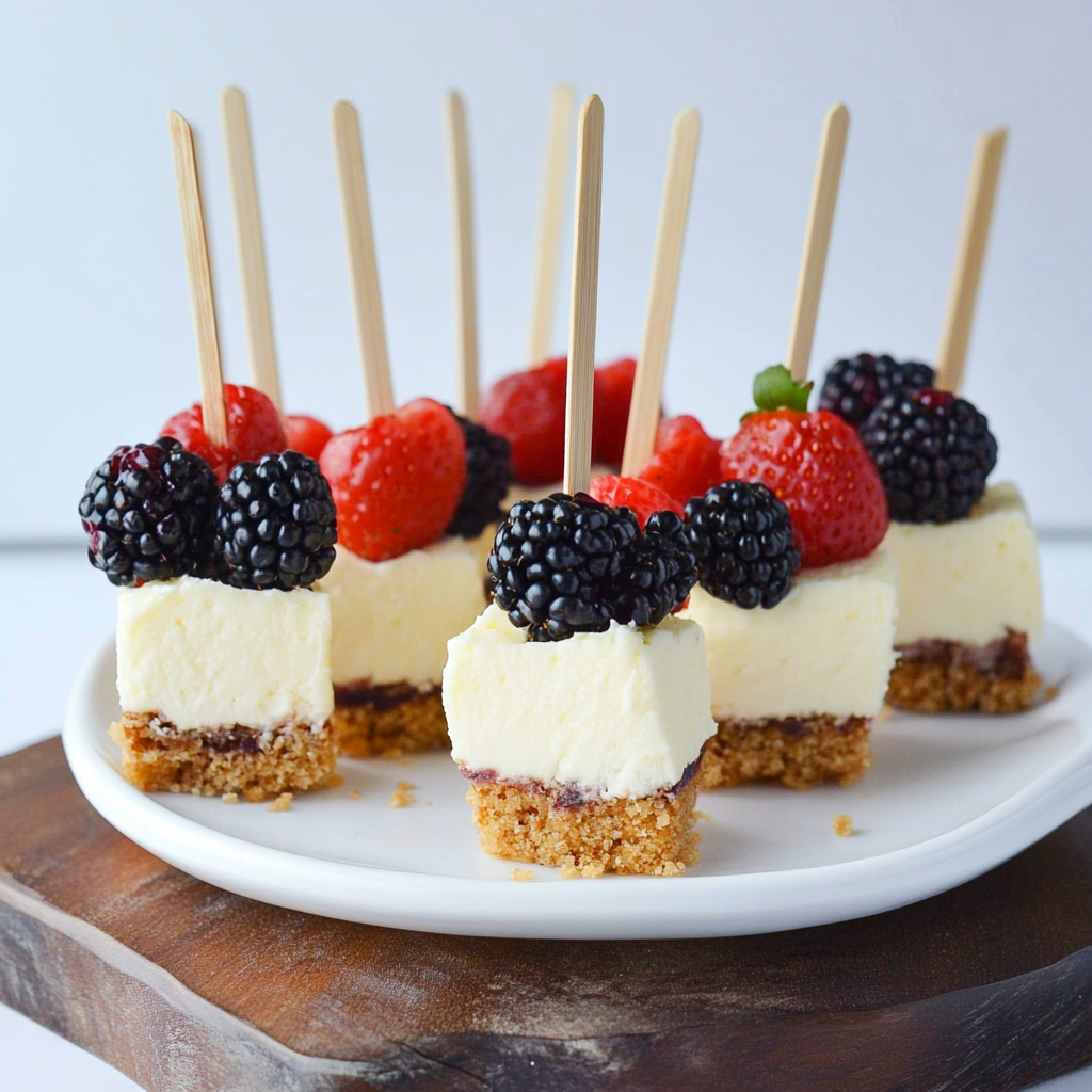 - Take a skewer and thread a few blueberries first, followed by a piece of cheesecake. Alternate with strawberries, more cheesecake pieces, and finish with blackberries. Continue until the skewer is filled to your liking.