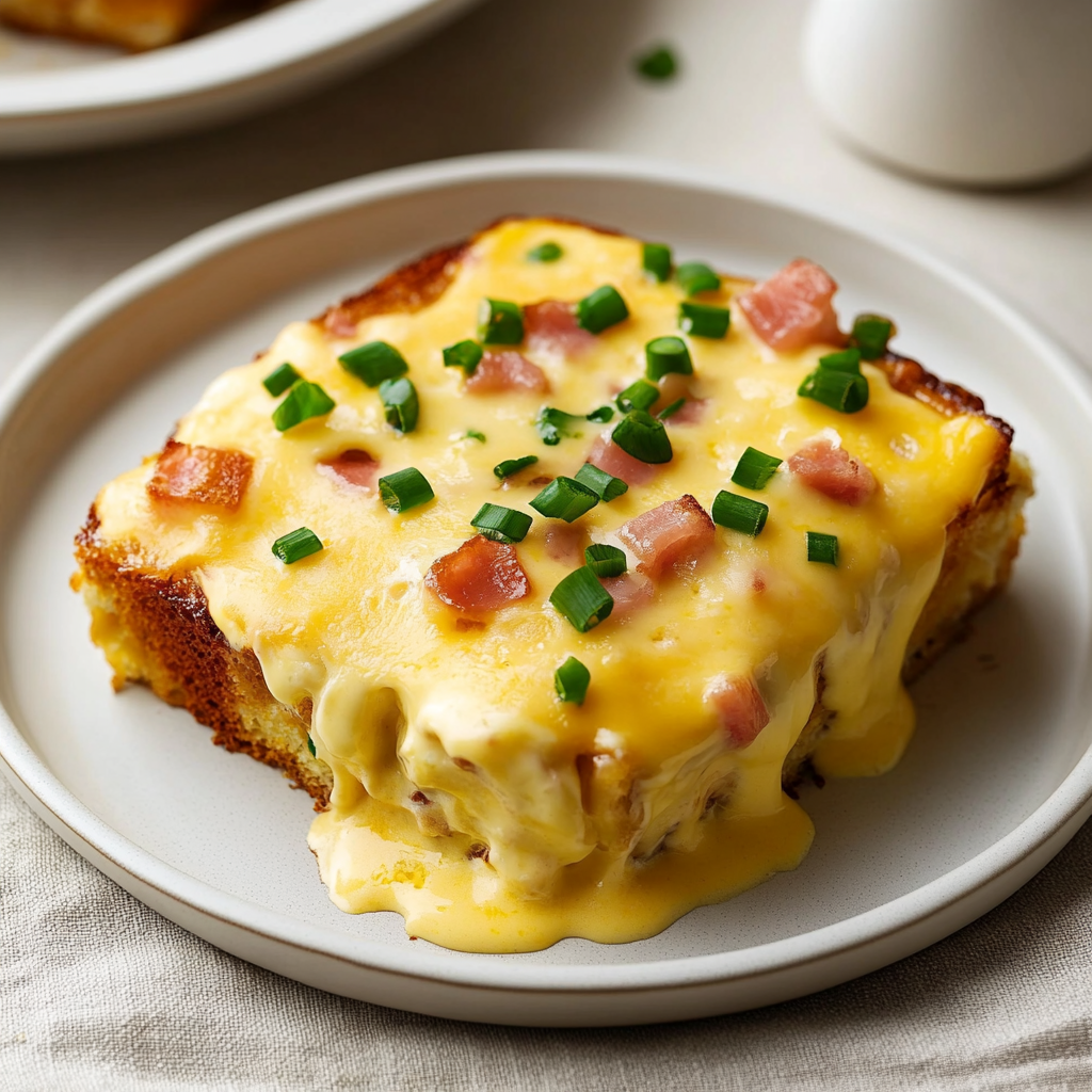 Once baked, slice your casserole into squares and drizzle each piece with warm hollandaise sauce before serving.