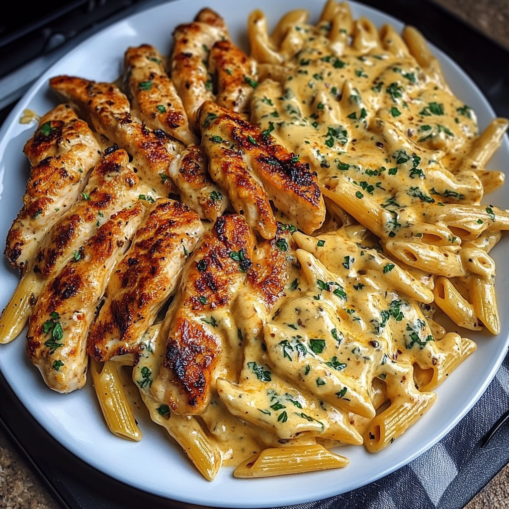Garlic Parmesan Chicken Penne in Creamy Cajun Three-Cheese Sauce